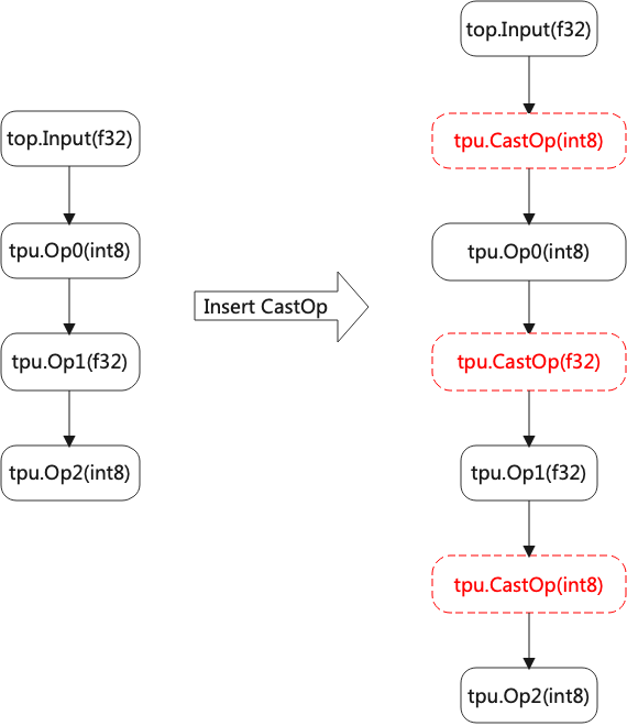 当OP之间的类型不一致时,则插入CastOp,如图所示(混合精度)。