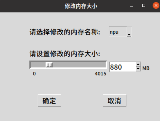 如上图,点击修改内存大小按钮后进入修改内存大小的子页面,在该页面可以选择修改内存区域的名称,可以拉动滑条设置所修改内存的大小,也可以手动输入和点击上下按钮设置所修改的内存大小,但是不能超过该内存区所属的DDR channel的可用空间大小。